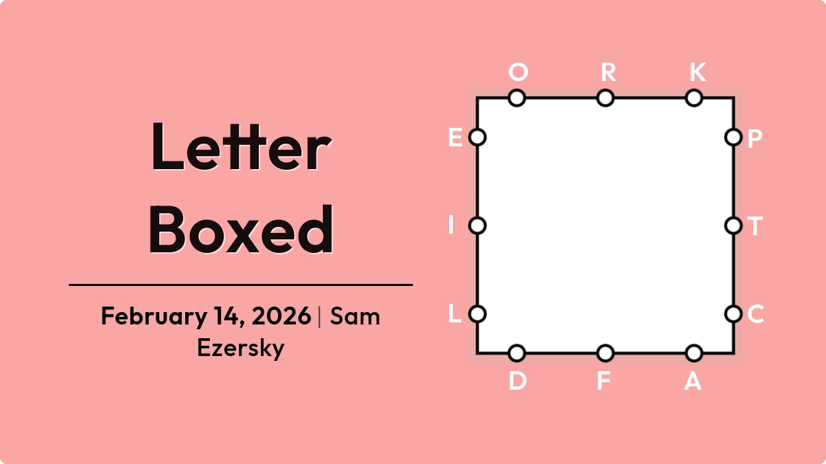 14 February, 2026 Letter Boxed Answers. We solved this puzzle for you. You may start to form words, in whichever direction you prefer enough that you form: