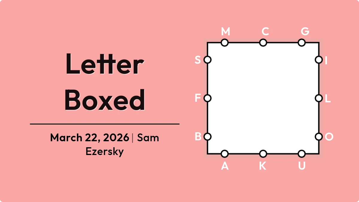 22 March, 2026 Letter Boxed Answers. We solved this puzzle for you. You may start to form words, in whichever direction you prefer enough that you form: